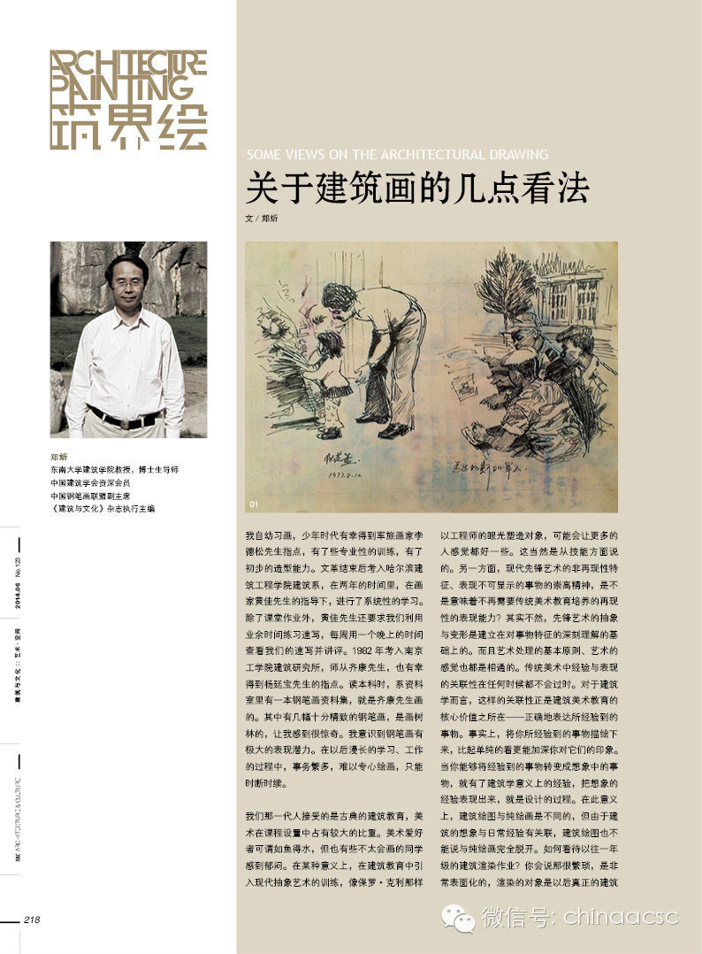 绘画之于建筑师正如修辞之于作家,皆是不可或缺之素养。建筑师的画较之现实设计作品更富抽象性与艺术感染力,乃是灵感与实体的过渡演绎。本期“筑界绘”栏目特刊东南大学低碳建筑研究所所长、博士生导师、中国钢笔画联盟副主席——郑炘教授的水彩、钢笔画作品,并邀其撰写《关于建筑画的几点看法》,图文并茂,相得益彰;让读者不仅得以领略到一位建筑师的绘画研习历程,更能近距离端详其科学严谨背后的艺术灵动…… 另有更多精彩内容,详见2014年第6期“本土营造”、“手记”、“聚焦”、“古城”、“阅城”等栏目及杂志公众账号。